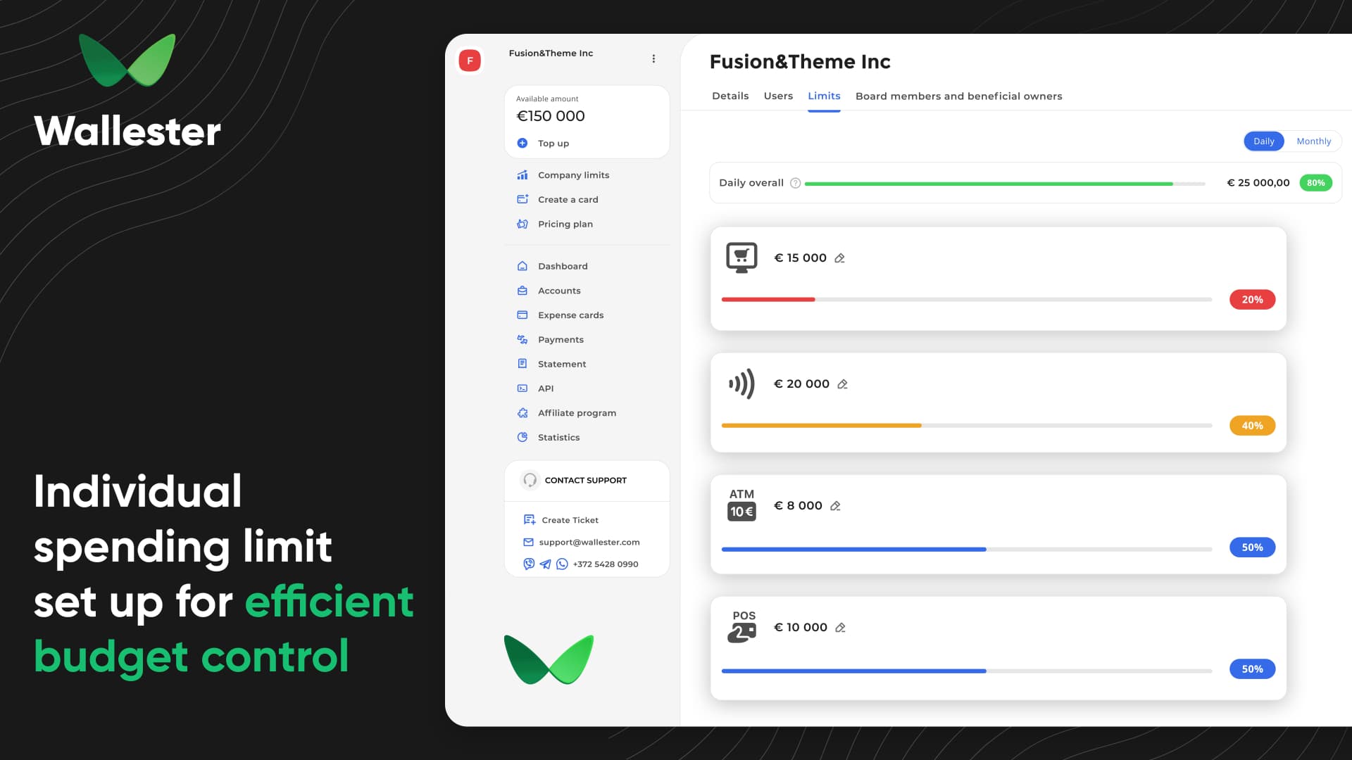 Customizable spend controls mean you can set card limits, assign cards by department, and instantly freeze or cancel if needed. The days of manual reconciliation and endless spreadsheets? Pretty much over, Wallester automates the busywork and gives you a clear financial snapshot at any time.