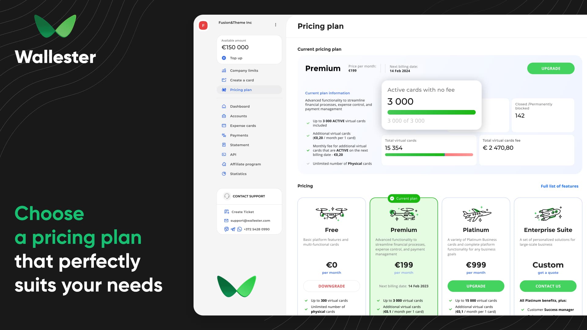 - Platinum Plan: €999/month. Go big: 18,000 virtual cards, a dedicated relationship manager, and hands-on onboarding for a smooth start.
