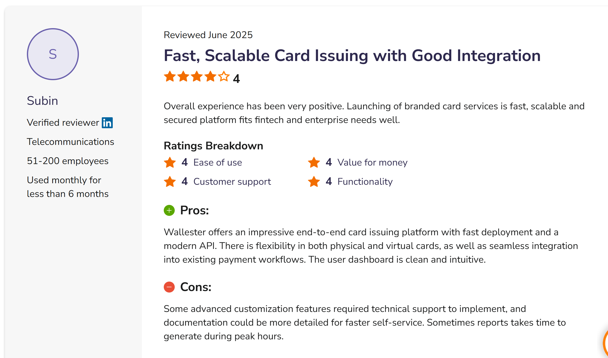 A: Wallester’s API is fast, stable, and developer-friendly, with low latency and a sandbox environment for testing. It allows for instant card issuance, the ability to check balances, and retrieve information for transactions; however, there were no advanced integration examples for some of the more advanced features.