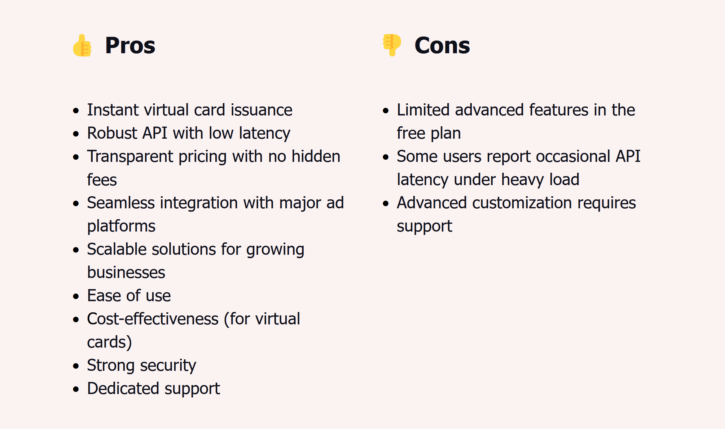 Best for: Media buyers, finance managers, and fintech developers seeking flexible, API-driven virtual cards with transparent pricing.